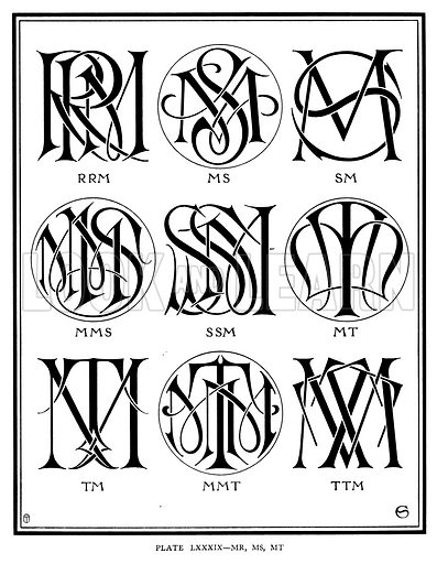 Right: RRM, MS, SM, MMS, SSM, MT, TM, MMT, TTM. Illustration for Monograms and Ciphers designed and drawn by A A Turbayne and other members of the Carlton Studio (Caxton, 1905).