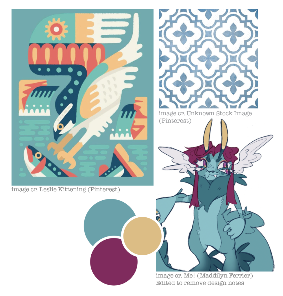 Moodboards. If they look strange I’m afraid there’s nothing I can do about the saturation. They’re more vibrant in illustrator, and the first one is strange considering I know what that art looks like. It may be a CMY vs. RGB thing. They’re screenshots as this is more accurate than the export which had the opposite problem.