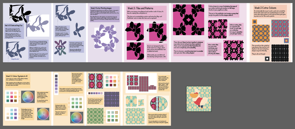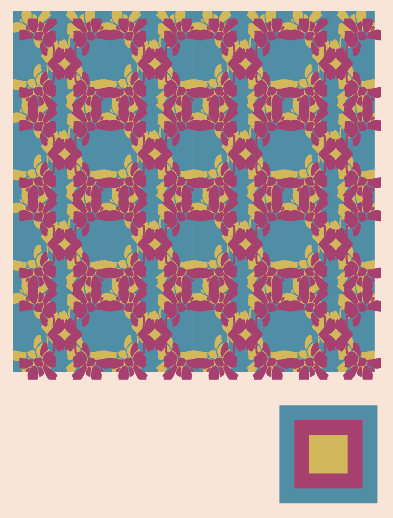 In all seriousness, the biggest challenge was working out colourways. Putting them together in the context of my patterns’ limited sections was harder than I thought. I think if I were to do this task again I’d choose a more complicated shape, or at least a different one considering the context of later steps.